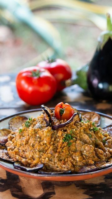moroccan cooked eggplant and tomato salad, served as a starter or side dish.A